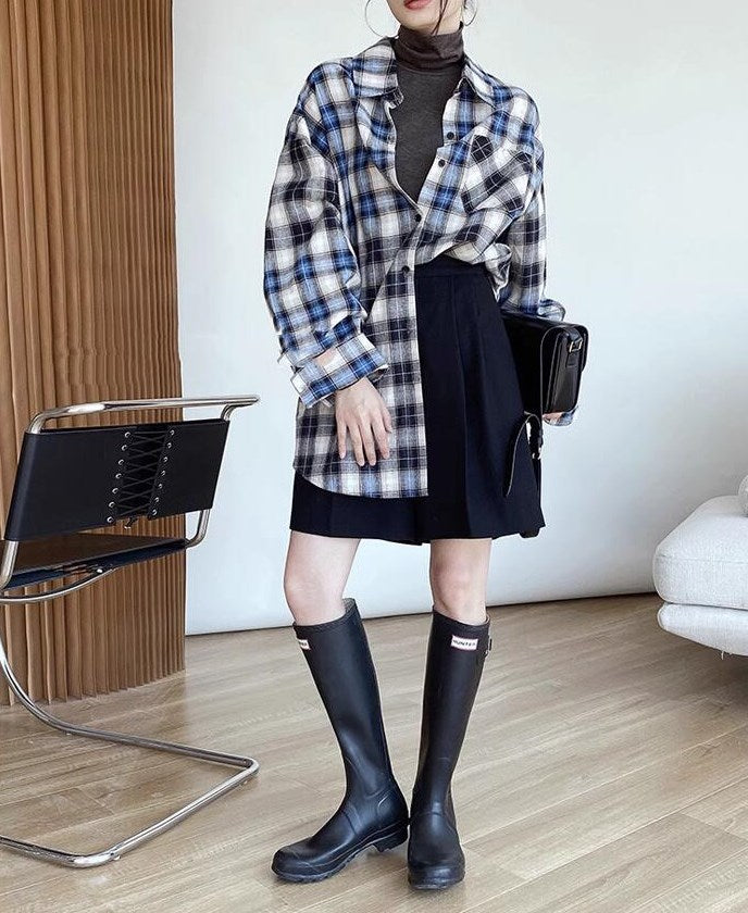 トレンディーなチェック柄とタートルネックをおしゃれにレイヤードして、ショートパンツを合わせたロングブーツのコーディネート。レイヤードやタートルネックといったテクニック・デザインは、季節感を意識したスタリング方法ですよね。シャツの大きめシルエットが、華奢で可愛らしくしてくれます。