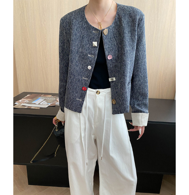 さまざまな形とカラーのボタンが目を引くショートジャケット。シンプルな白パンツと合わせるだけで、こなれ感たっぷりのスタイリングに。短め丈だからワイドパンツやスカートとも好相性。デザイン性が高く、羽織るだけで今っぽい印象が完成します。