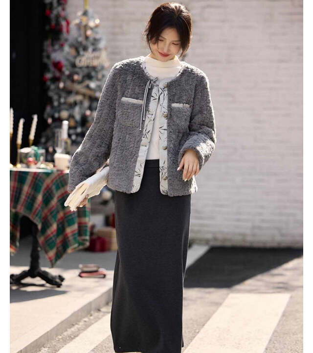 フェイクボアのような立体感ある素材が秋冬らしさを演出するノーカラージャケット。Tシャツとスカートのシンプルコーデに羽織るだけで、季節感のあるスタイルが完成。ポケットやボタンのデザインも絶妙で、大人のきれいめカジュアルにぴったりの一着。