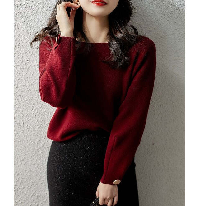 深みのあるレッドが肌をきれいに見せてくれる一枚。ビッグボタンがさりげないアクセントになり、スカートにもパンツにも相性抜群です。落ち着いたカラーでも華やぎを忘れない優秀トップスです。