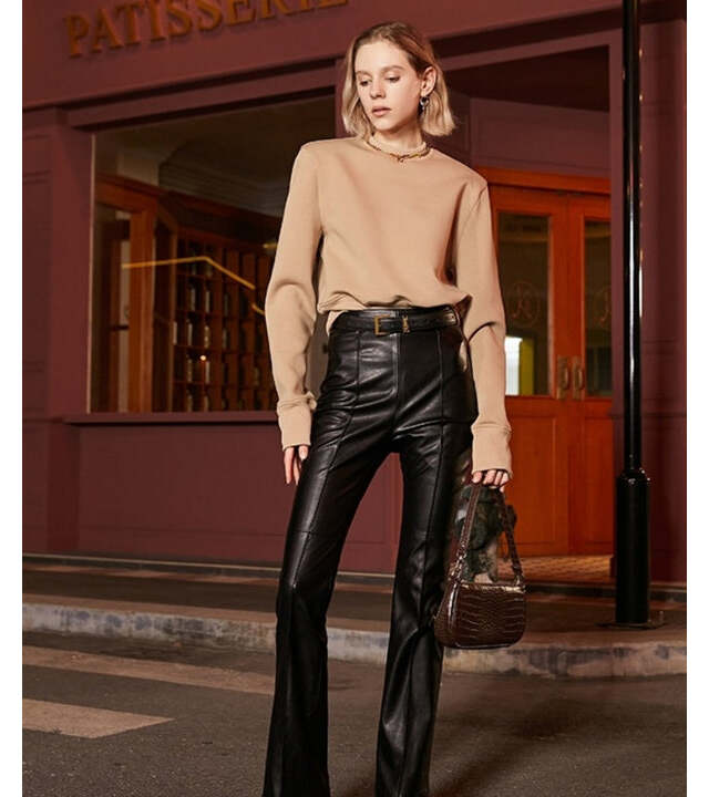 スクリーンの中で女優さんが着るにはカッコいいけど日常にはどう着こなそう?一見難しそうなレザーパンツですが、真逆なテイストのスウェットが意外とマッチします。スウェットの抜け感がレザーのハードさをいいあんばいに削ぎ落し、普段の生活にも溶け込める1枚に。