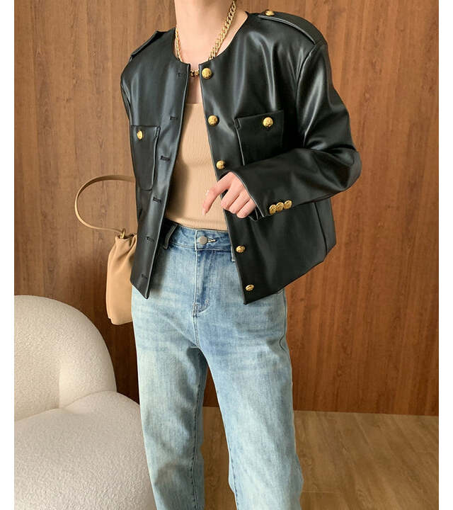 素材のインパクトもさることながら、エポレットとゴールドボタンが目を惹くジャケット。ミリタリー調のデザインがハンサムです。ウォッシュドデニムとチェーンネックレスでロック風に着てみても。ショート丈でマニッシュになり過ぎないのが嬉しいですね。