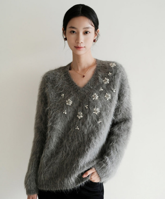 ほどよいシャギーが優しい印象のニットプルオーバー。自然なツヤとなめらかなテクスチャーが特徴のアルパカが、柔らかく身体を包みます。花モチーフのビジューとVネックで華やかさアップ!