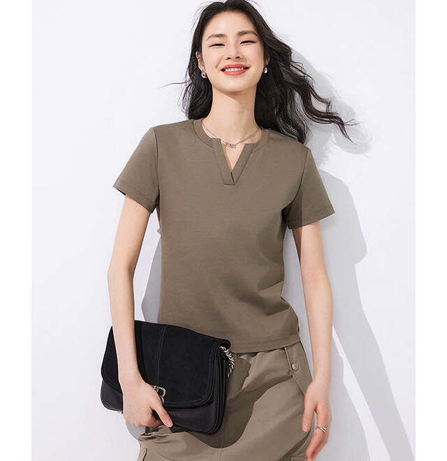 抜け感をプラスする「Vネックブラウントップス」
