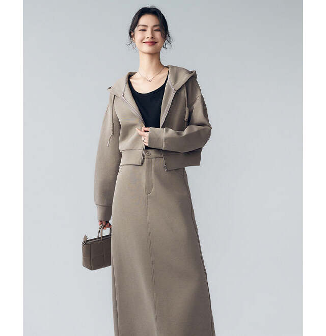 バージンコットン素材のセットアップは、モカカラーの深みが魅力。ショートジャケットはウエストラインを自然に強調し、脚長効果が狙えるのもポイントです。セットで着こなせばシックな雰囲気に、インナーを明るいカラーにすると抜け感のある大人の余裕スタイルに。小物にレザーやゴールドを取り入れると、より都会的で洗練されたコーディネートに仕上がります。