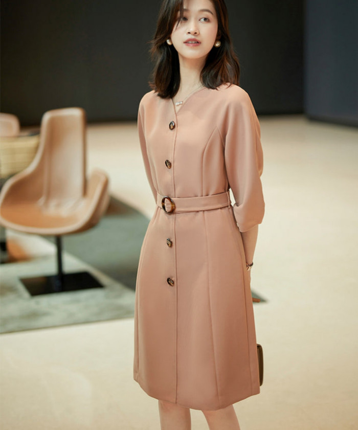 柔らかく上品な印象のワンピース。クラシカルで上品な印象なので、フォーマルでもカジュアルでも活躍しそうです。べっこうデザインの光沢やツヤ感のあるベルトのバックルとボタンが、素敵な大人っぽさを演出してくれます。