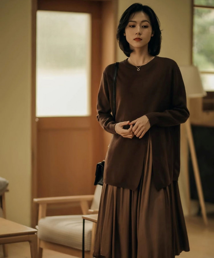 女性らしいシルエットが魅力のニットワンピース。デイリーに着こなしやすいのもポイントです。ニットやカーディガンを肩掛けすると、コーデに奥行き感とこなれ感が生まれます。