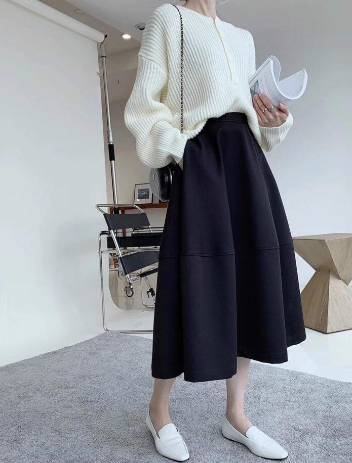 女性らしい優雅なスタイルに見えるアンブレラスカート。ニットインをすることでそれぞれのアイテムを活かし、メリハリのあるコーデになります。