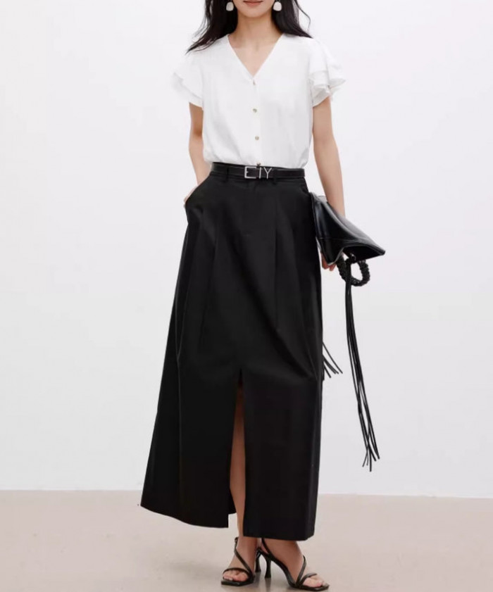 スリットがセクシーなタックスカート。ベルトを付けたり、タックがあったりすることで、シルエットに立体感が生まれます。トップスをタックインすることで、キレイめコーデに。