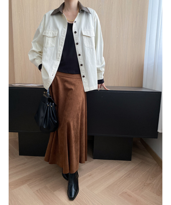 ベージュとブラウンのコントラストがかわいいレザーワークジャケット。柔らかい印象のブラウンのスカートとコーデを引き締めるブラックのインナーや小物と合わせることで、カッコよさとかわいさを両立したコーデになります。