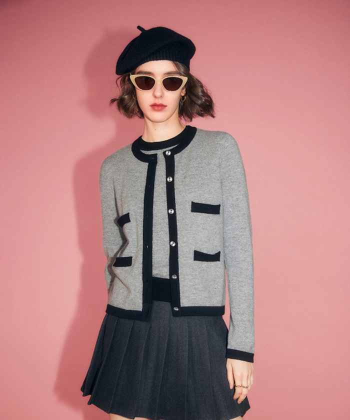 ブラックとグレーの配色がおしゃれなカーディガン。キラキラしたボタンがかわいさをプラスしています。ミニスカートと合わせて大人レディな印象になりますよ。