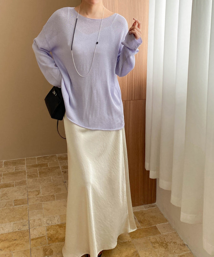 爽やかなパープルカラーのルーズニット。オーバーサイズ感がおしゃれです。白のロングスカートを合わせて、柔らかい印象に。