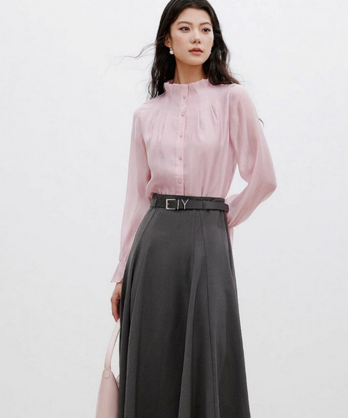 ネックラインのフリルがポイントのピンクブラウス。クラシカルな雰囲気を演出してくれるアイテムです。グレーのスカートをプラスすると、フォーマルにコーディネート。