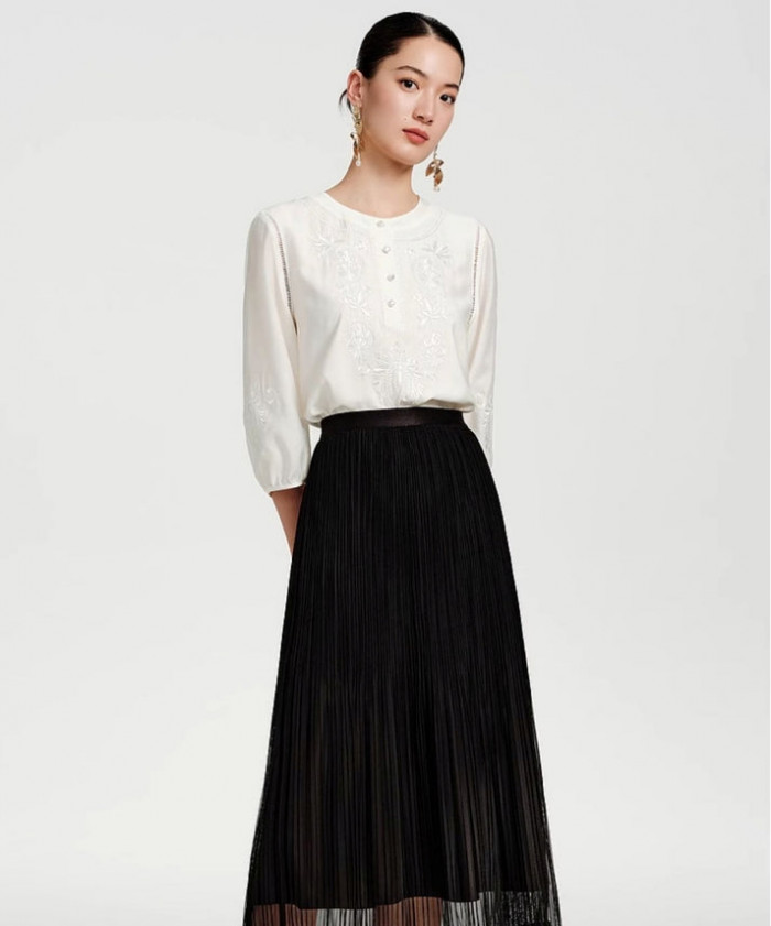 淡いベージュカラーのフラワー刺繡ブラウス。エレガントな雰囲気を演出してくれます。黒のスカートを履いて、スタイリッシュに。