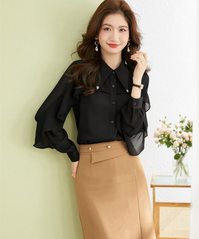 フリルスリーブがアクセントになったシフォンシャツ。きちんと感とおしゃれを兼ね備えたアイテムです。タイトスカートを合わせて、華やかにコーディネート。