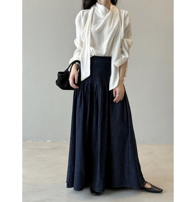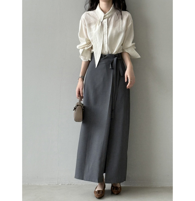 こちらもスカーフを巻いたようなデザインで、ドレープが効いた女性らしいデザインシャツ。着るだけで首元が華やぎアクセサリーいらずの存在感。ロングスカートと合わせるとよりエレガントな装いに。スカートのシルエットはフレアとタイトでまた違った印象を楽しめますよ。