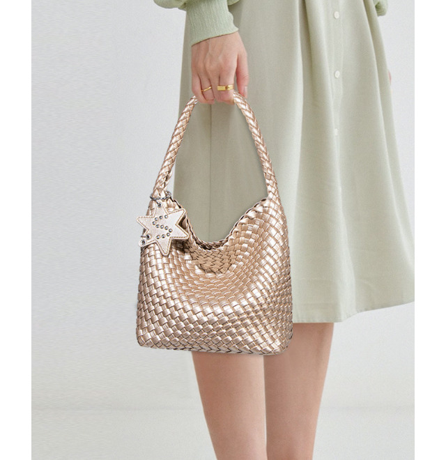 メタリックカラーのバッグは、モノトーンコーデの差し色やアクセントをプラスするのにおすすめ。ワンハンドルでラフに持てるのでちょっとしたお出かけにもぴったり。巾着とセットなのでバッグの中のごちゃつき問題も回避。