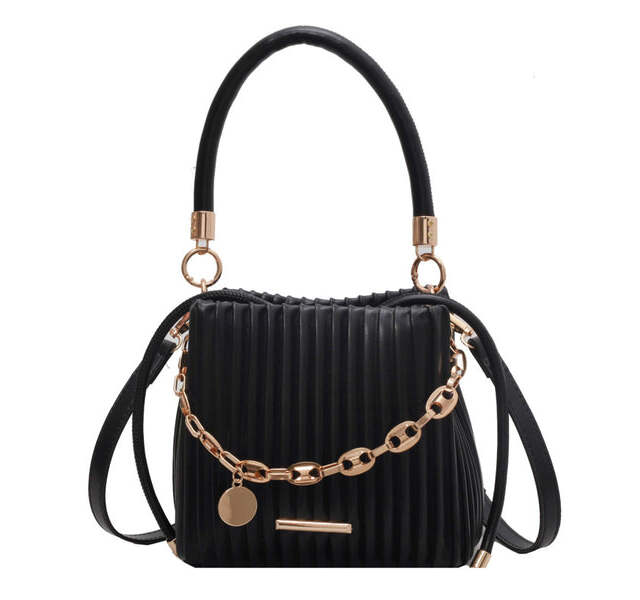 女性らしさを引き立てるコンパクトなバケットバッグ。チェーンの装飾が華やかで存在感も抜群。きれいめなコーデにはもちろん、カジュアルコーデの外しとしてもおすすめ。コンパクトながらも最低限のものは入れられる大きさなのでお出かけにも安心。