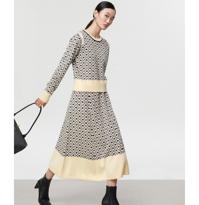 上品な幾何学柄が視線を惹くデザイン。ジャカード素材が高級感を添え、華やかさときちんと感を両立します。単品でも活躍できるので、着回し力も抜群。シンプルな小物を合わせてバランスをとると大人らしい洗練された印象に。