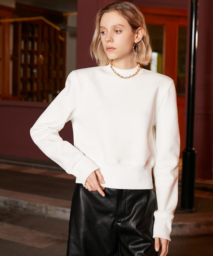 コンパクトな丈感とモックネックが特徴のクロップドスウェットは、ハイウエストのパンツやタイトスカートと相性抜群。スポーティさの中にモード感が漂い、きちんと感のあるアウターを羽織れば一気にバランスの取れた大人コーデに。