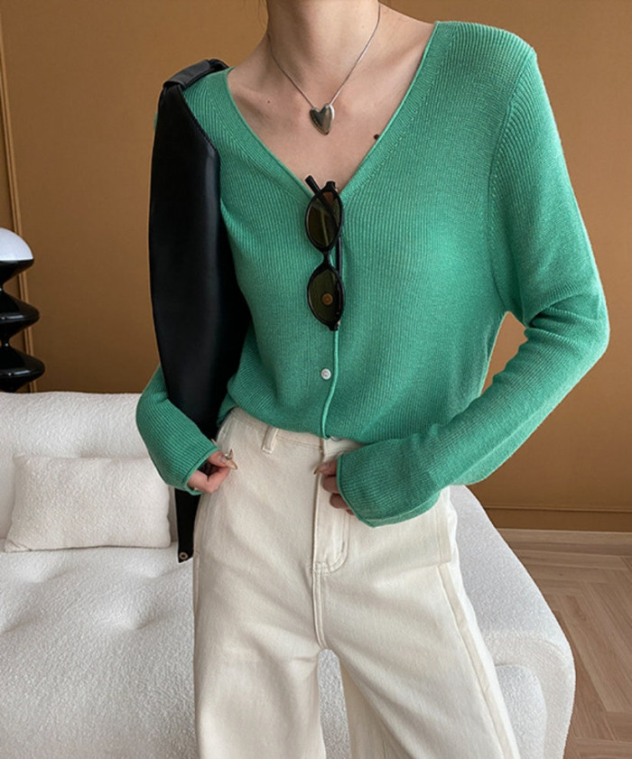大きく開いたVネックがデコルテを非常に綺麗に見せてくれて、さらに軽やかさを感じるライトトーンのグリーンの色味がさらにヘルシーで、おしゃれな印象に見せてくれるカーディガン。洗練された印象はあるのに、どこかカジュアルな雰囲気があるのが嬉しいですよね。大活躍間違いなしのアイテムです。