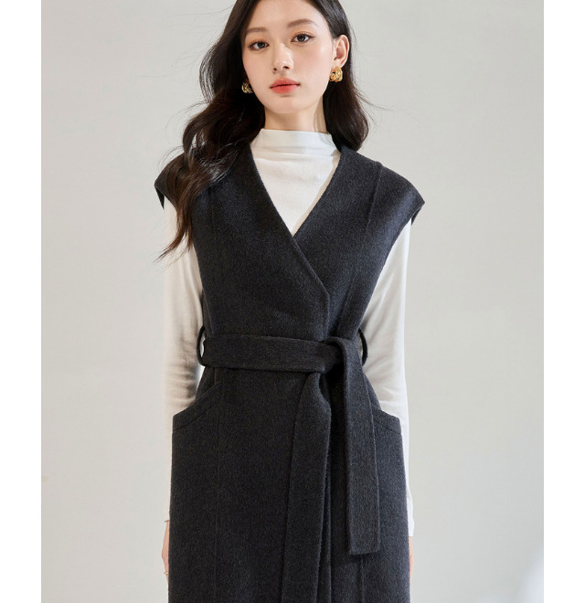 地味見えしがちなグレーのワントーンコーデも、ベストの着用でぱっと華やぎが加わります。レザーベルトでウエストマークをして、女性らしいアクセントを加えるのもおすすめです。