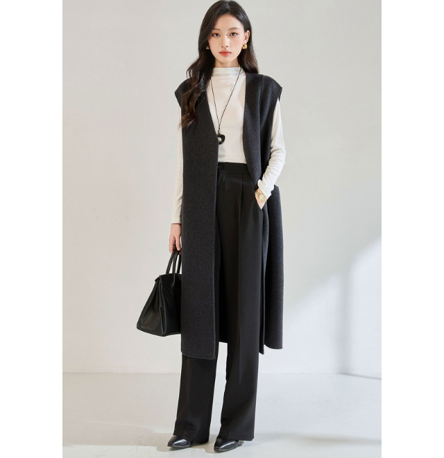 シャツやTシャツ、どんなトップスにも合わせやすく、“おしゃれ上級者”な印象に。大きく開いた印象的なハイネックの衿元がコーデのアクセントになっています。