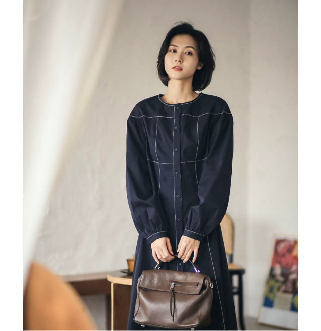 知的な印象のネイビーに、ラウンドの衿元やランタンスリーブで大人の可愛さをプラス。