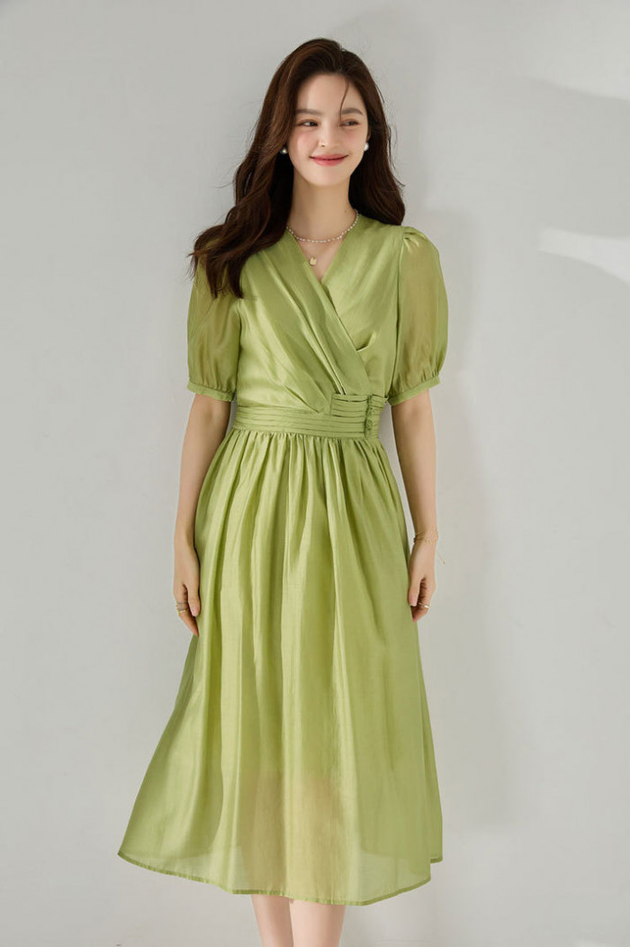 鮮やかなグリーンのレトロワンピース。Vネックがデコルテを美しく見せてくれます。歩くたびに裾が軽やかに揺れてエレガント。