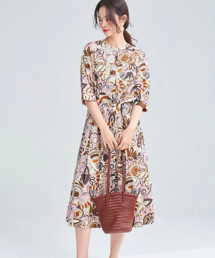 グラフィカル柄がプリントされたワンピース。コットン100%の生地なので、優しくふんわり包み込んでくれるような肌触りが魅力的です。