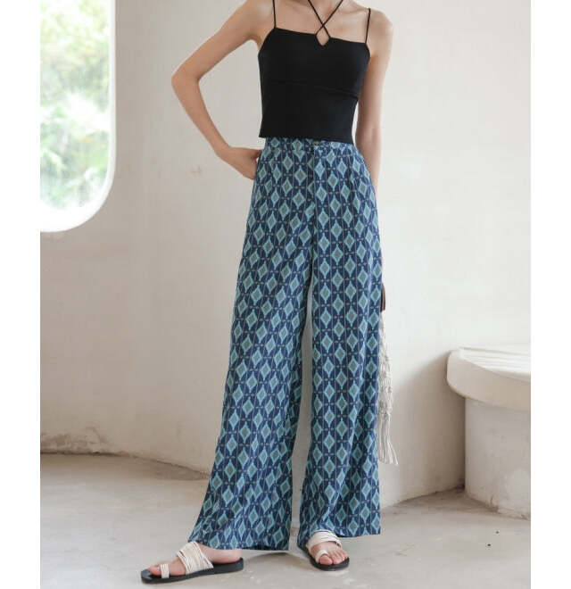 エキゾチックでモダンなデザインのワイドパンツ。ハイウエストなので、スタイルアップ効果があります。ドレープ感のある生地で、女性らしく柔らかな印象に。