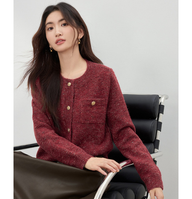 花柄が織り込まれたデザインは、ボルドーの持つ大人っぽさに優しい可愛らしさをプラス。無地のワンピースやシンプルなトップスに羽織るだけで、ぐっと華やかで女性らしい雰囲気に仕上がります。