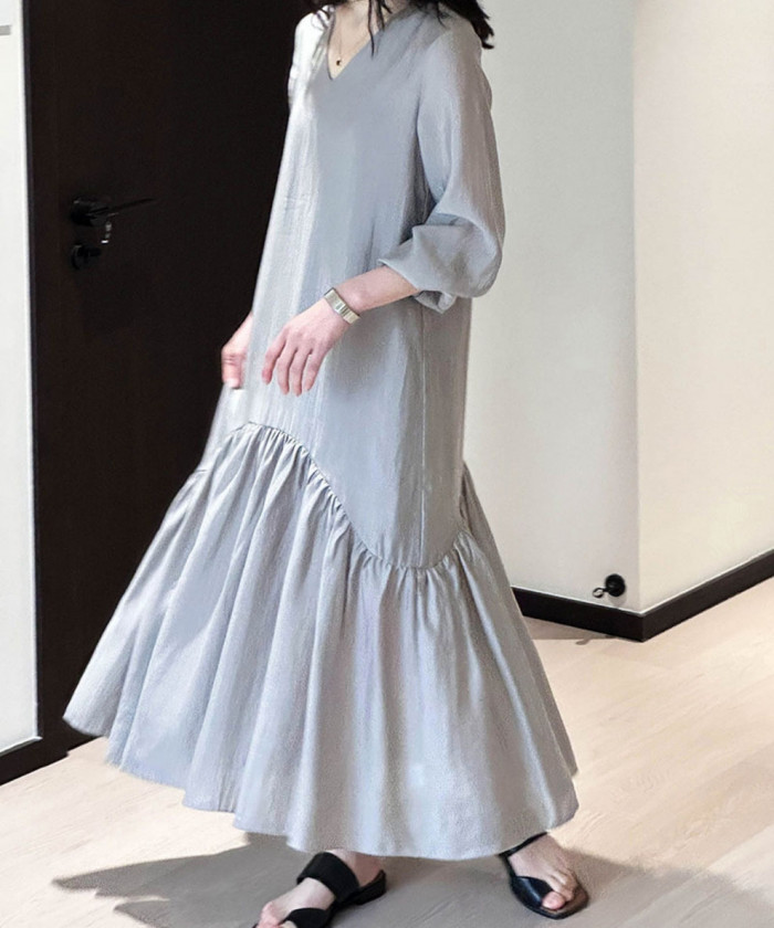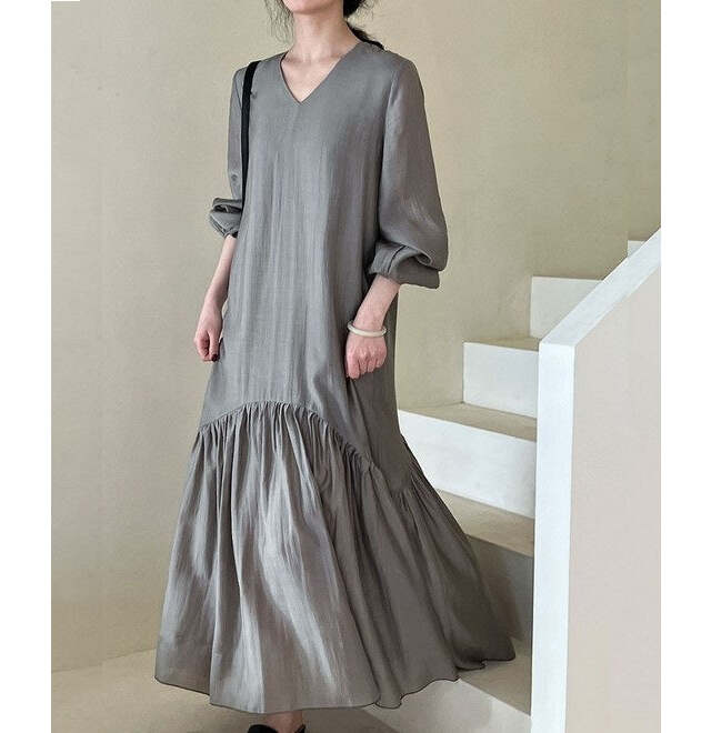 シンプルなシルエットながら、裾のフィッシュテールデザインが存在感を放つワンピース。ニュートラルなグレーに立体感が加わり、特別な日のお出かけにも映えます。シルバー系アクセサリーやバッグを合わせれば、さらに洗練された大人の雰囲気に。