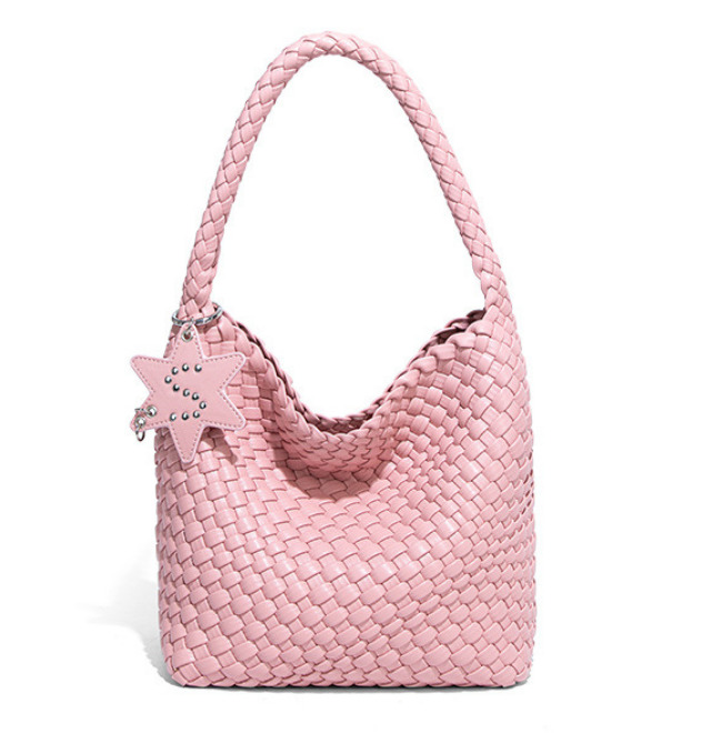 光沢感や手織りの繊細なイメージのあるテクスチャーが、高級感を演出してくれる手織りハンドバッグ。薄めのピンクの色味がコーディネートにアクセントをつけてくれますが、きらいの無い色なので何にでも似合う使い回しのしやすい優秀アイテムなのです。ハンドバッグなのでシルエットを崩さずに持てます。