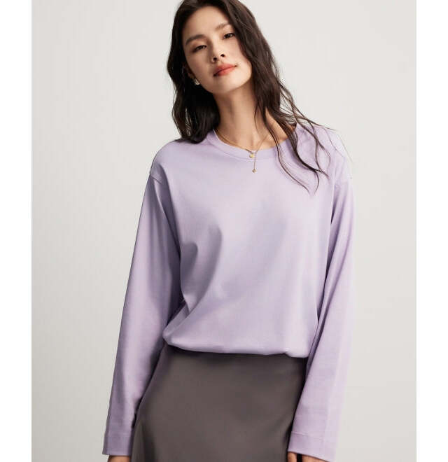 シンプルかつ定番的なデザインが、着回し力抜群かつ着こなしに失敗をしない安心感もあるカットソー。色味は、今季のトレンドカラーであるパープルカラーを選び、トレンディーで軽やかな着こなしを叶えます。ストレスフリーに着用できるゆったりとしたサイズ感で、家でも出先でも楽ちんです。