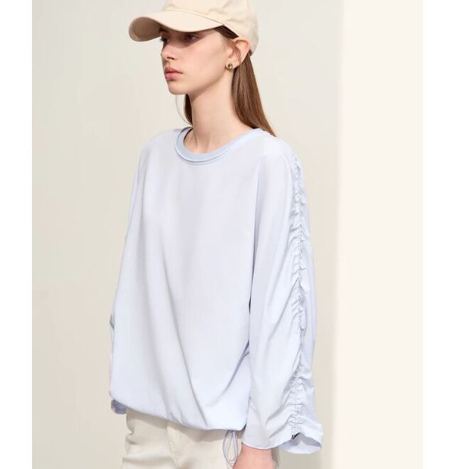 袖にデザインされたシャーリングがポイント。シャーリングカットソー