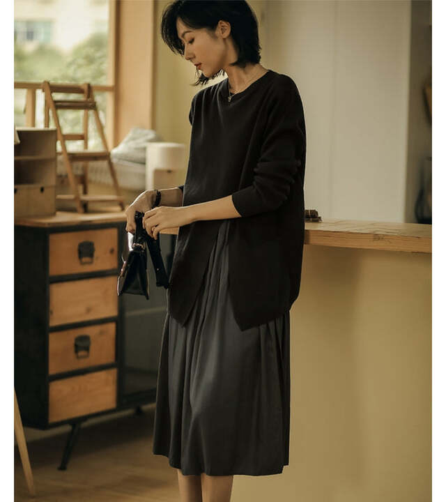上記2点とは表情の違ったプリーツが新鮮。ひだ山が曖昧なソフトプリーツのワンピースです。ふんわりと柔らかなスカートに合わせてトップス部分もゆったり。見た目にも着心地もらくちんが嬉しい。アシンメトリーなトップス部分の裾で洒落感もしっかりと感じられます。