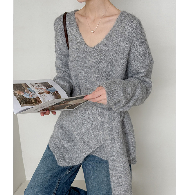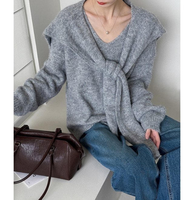 シンプルながらもふんわりとした素材感、広めに開いたVネック、ゆるっとこなれたサイズ感、と細部にこだわりの感じられるセーター。1枚でもお洒落ですが嬉しいショール付きです。肩にかけたり、腰に巻く際には結び目をサイドに持ってくるなどアレンジを愉しんでみて。