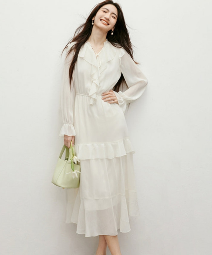 スウィートなデザインのフレアロングワンピース。ホワイトカラーが清潔感を演出してくれます。グリーンのバッグを持って、爽やかに。
