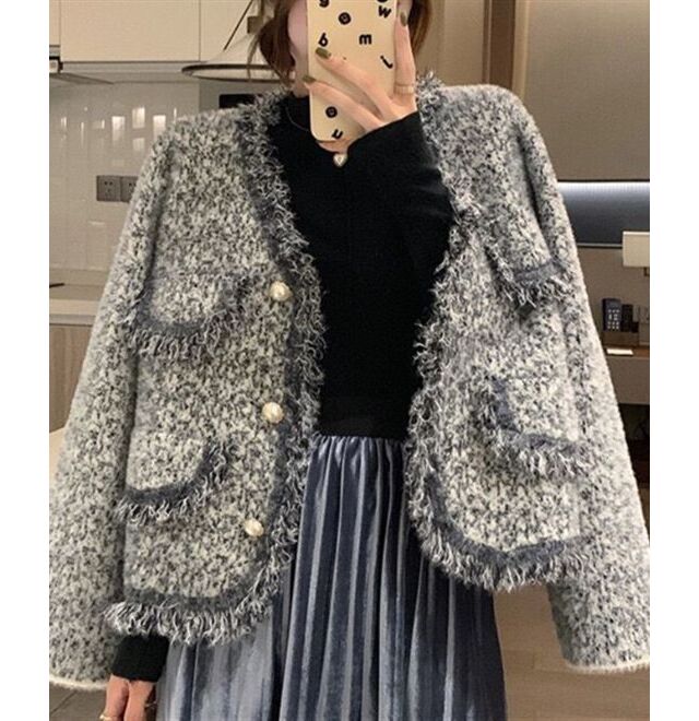 こちらはツイードジャケット風のカーディガン。きちんと見せたいけどジャケットを羽織るほどでもない、そんな時にちょうどいい。また、ジャケットにマンネリを感じている人にもおすすめです。カーディガンだからこそ出せるミンクベルベットのやわらかな質感も魅力。
