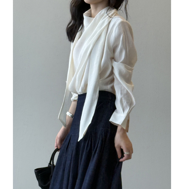 シンプルな白トップスに奥行きを与え、顔まわりをやわらかく華やかに見せてくれます。上質な素材感が際立ち、ジャケットインにもおすすめ。フォーマルにもデイリーにも活躍する一枚です。