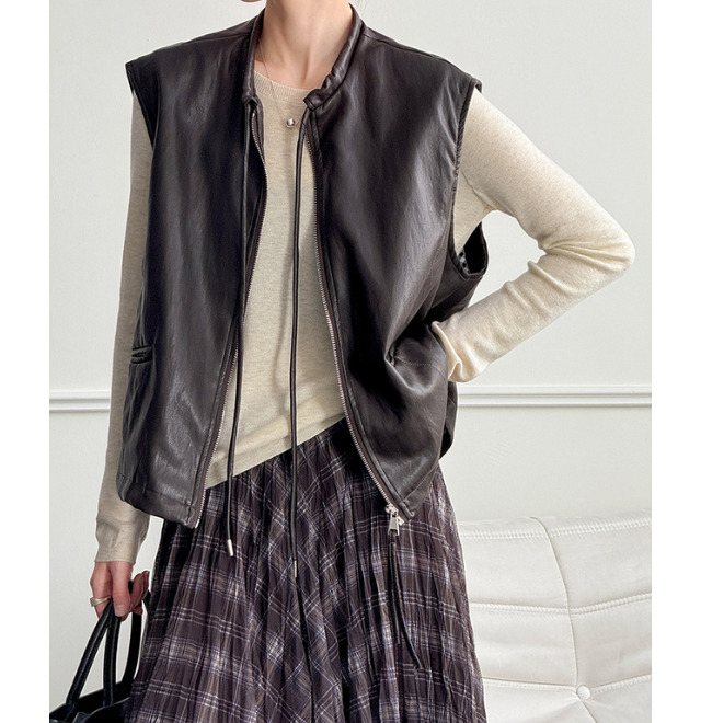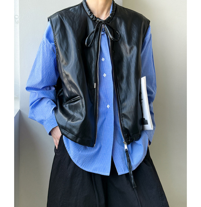 ポリエステル素材のフェイクレザーベスト。バランスの取りやすいショート丈です。