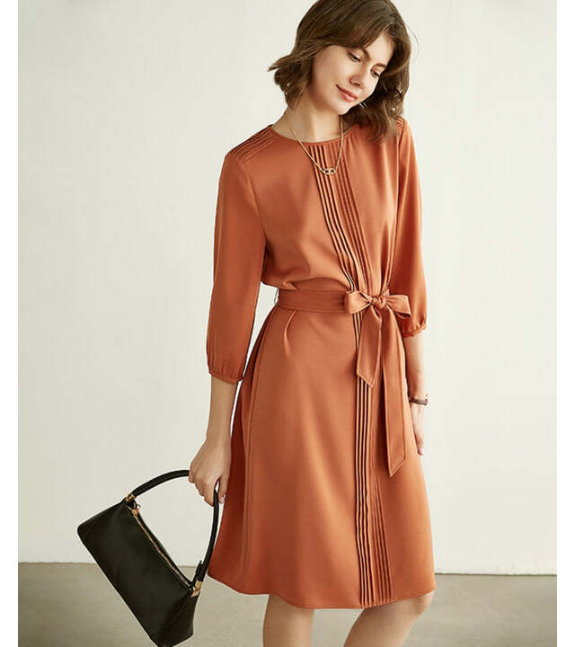 ピンタックデザインと、飾りすぎないシンプルなシルエットが上品なこちらのワンピース。落ち着いたトーンのオレンジなので肌馴染みがよく、大人っぽい印象に。ダークカラーの小物で引き締めるとバランスよく見えますよ。