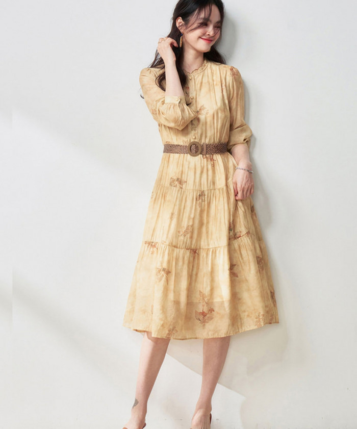 ブラウンの色味が季節感を感じさせ、スウィート×ナチュラルな雰囲気を併せ持つティアードフレアーワンピース。フレアーなだけでなく、ティアードというガーリーさを足しているのが嬉しいポイントです。ボヘミアンなナチュラルテイストのおかげで、過剰な甘さになることを抑えてくれているのです。