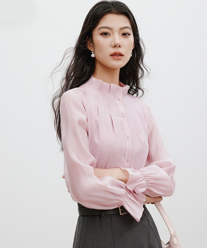 ふんわりとした袖が可憐なランタンスリーブブラウス。くすみピンクの柔らかいトーンが、肌の透明感を引き立ててくれます。白やグレージュのボトムを合わせて、軽やかで優しい雰囲気に。