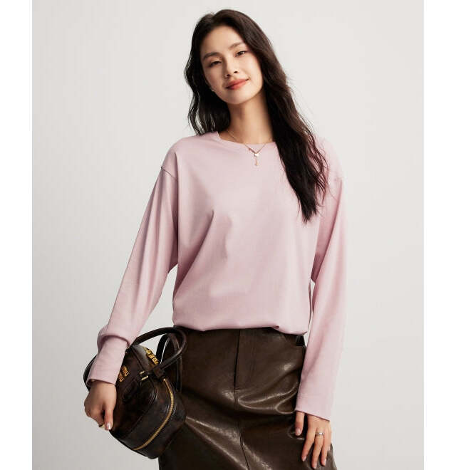 シンプルなコットンラウンドネックカットソーも、くすみピンクなら大人顔。上質なコットン素材がほどよいハリ感を保ちながら、柔らかな印象を演出します。デニムやジャケットと合わせて、フェミニン×カジュアルの絶妙バランスを楽しんで。