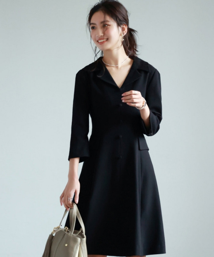 「クラシカルテーラードワンピース」は、きちんと感のあるテーラードデザインが特徴。シャープな襟とすらりとしたシルエットで、ビジネスシーンでも“信頼感”を与えます。黒やネイビーのタイツで脚を引き締め、足元にはレザーのパンプスやショートブーツを。小物を同系色でまとめると、より統一感のある通勤スタイルに。