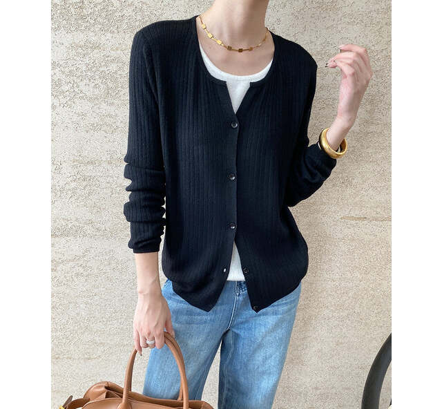 季節の変わり目に一枚あると重宝するのが、薄手の細リブニットカーディガン。肌にほどよくフィットするリブ編みが、すっきりとしたシルエットを演出し、羽織るだけで上品な印象に。ブラックカラーはどんなコーディネートにも馴染み、オフィスでもカジュアルでも万能に活躍します。夏は冷房対策に、秋口はブラウスやカットソーに重ねて。ジャケット代わりにもなる軽やかさで、着回し力は抜群。シーズンレスに使える大人の定番アイテムです。