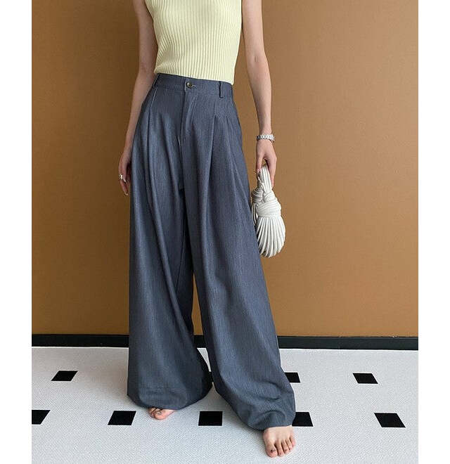 とろみのある素材にタックが入ったワイドレッグパンツ。濃いグレーはパステルカラーのアイテムとの相性抜群。淡いカラーのトップスと組み合わせても、コーディネート全体を甘すぎないクールな印象に引き締めてくれます。