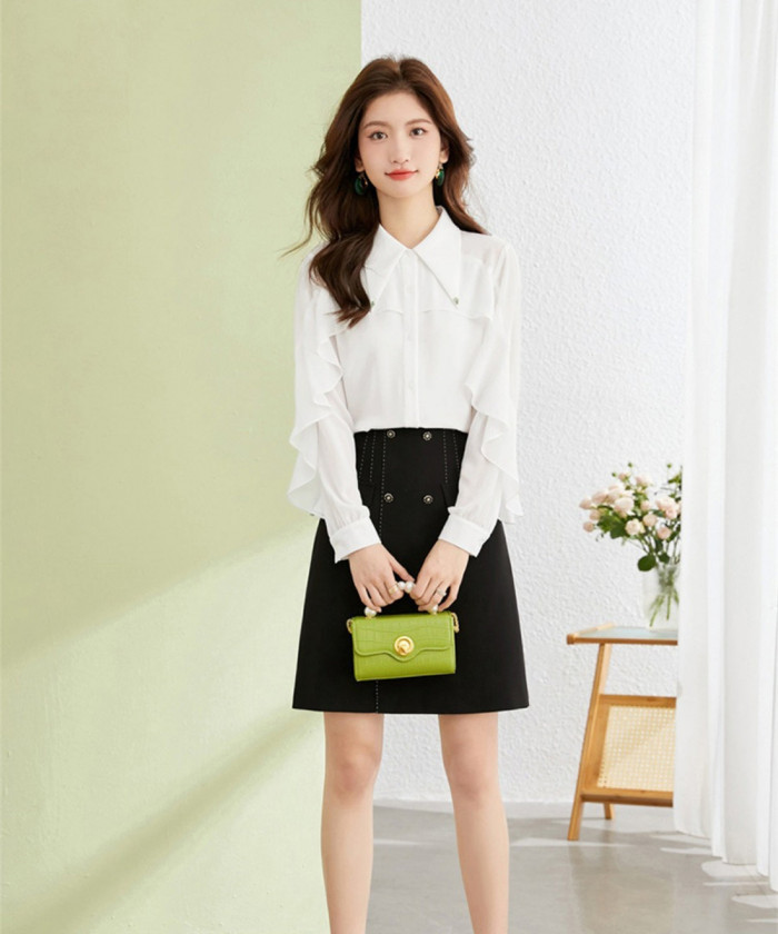 軽やかな素材と繊細なフリルが魅力の一枚。動くたびにふわっと揺れ、優しげな雰囲気を演出します。ホワイトやペールトーンを選ぶと、顔まわりが明るく映え、第一印象をぐっと華やかに。ハイウエストのスカートを合わせて、きちんと感のあるデートコーデに仕上げましょう。